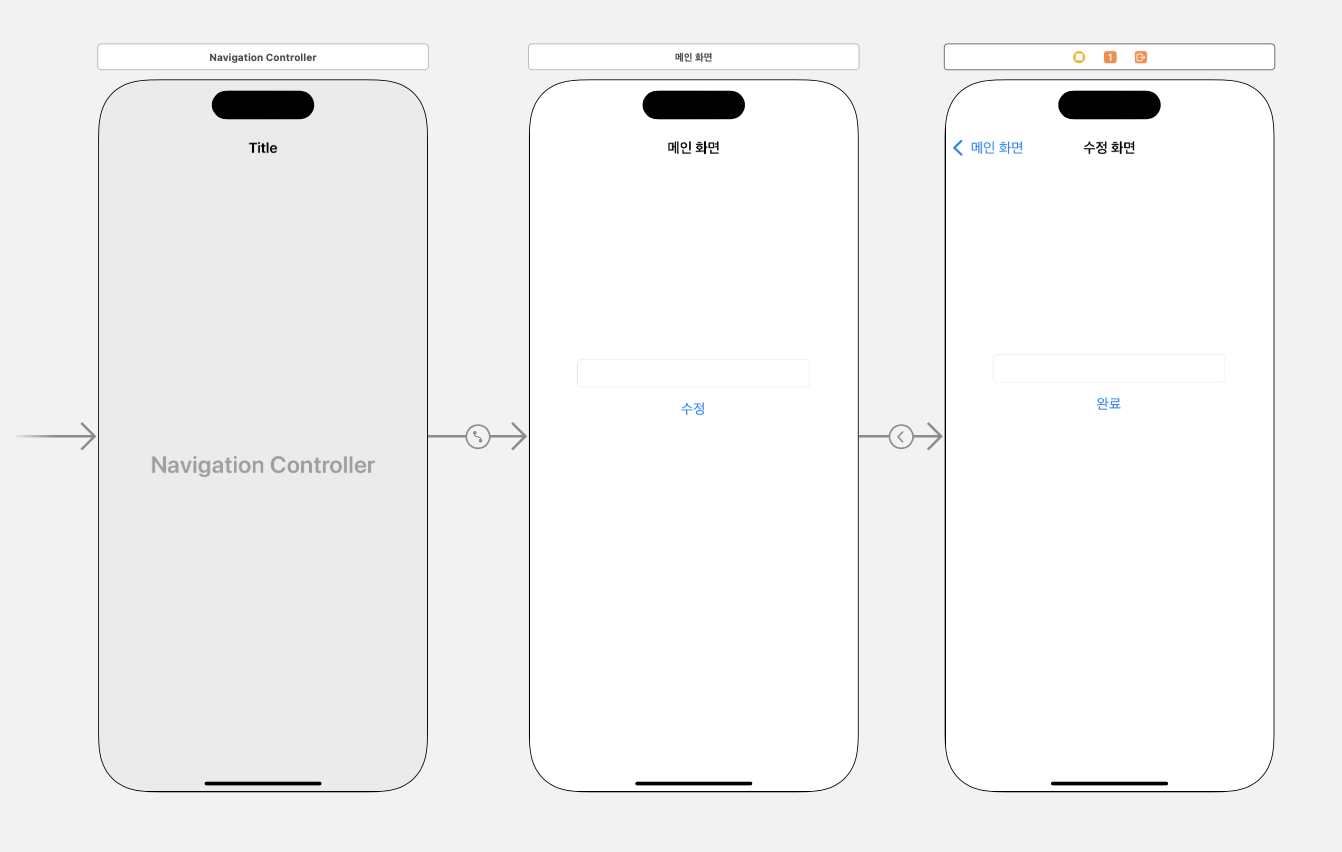 인터넷에서 찾은 예제를 따라한 모습이다. 큰 흐름은 메인 화면에서 수정 버튼을 누르면 두번째 화면인 수정 화면으로 넘어가고, 수정 화면에서 textField에 값을 입력 후 완료 버튼을 누르면 다시 메인 화면으로 넘어가고 textField에 입력한 값이 메인 화면의 textField로 넘어가는 식이다. 물론 메인 화면의 textField값도 수정 화면의 textField로 넘어갈 수 있다.