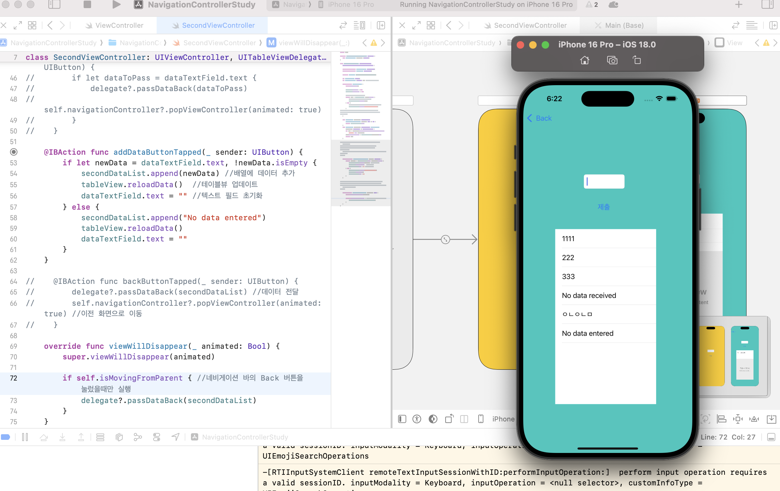 override func viewWillDisappear(_ animated: Bool) { super.viewWillDisappear(animated) if self.isMovingFromParent { //네비게이션 바의 Back 버튼을 눌렀을때만 실행 delegate?.passDataBack(secondDataList) } }viewWillDisapper는 viewDidLoad나 viewWillAppear 같은 뷰의 라이프 사이클 중 하나로, 이름 그대로 뷰가 사라지기 전에 호출되는 메서드라고 한다. 이 메서드를 override 하여 화면을 떠나기 전에 원하는 작업(첫 화면으로 데이터 전달하기)을 수행하는 것이다.